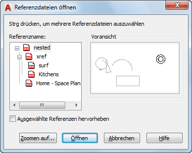 Das Dialogfeld Referenzdateien öffnen zeigt eine Baumstruktur mit allen verschachtelten XRefs an. Die Quelldatei für die ausgewählte XRef wird in einem separaten Fenster geöffnet, in dem Sie die Zeichnung bearbeiten, speichern und schließen können.