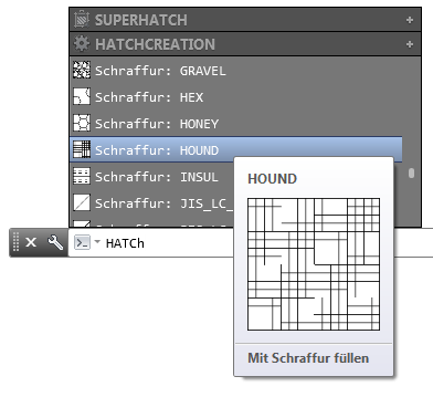 Beispiel: Sie möchten ein Schraffurmuster einfügen. Wenn Sie Schraff in die Befehlszeile eingeben und die TABULATORTASTE drücken, um durch die Optionen zu navigieren, wird die Befehlszeilen-Vorschlagsliste erweitert und zeigt verfügbare Schraffurmuster an. Ziehen Sie die Bildlaufleiste, um zusätzliche Schraffuren und Abstufungen anzuzeigen. Sie können eine Miniaturansicht aller Optionen anzeigen, indem Sie den Mauszeiger über den Namen bewegen.