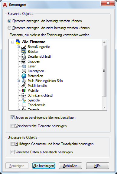 Diese Liste enthält die benannten Objekte, die nicht in der aktuellen Zeichnung verwendet werden und daher bereinigt werden können.