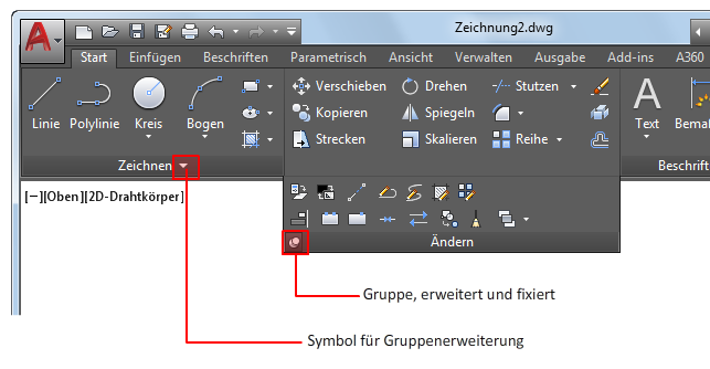 Sie können eine Gruppe von einer Registerkarte der Multifunktionsleiste in den Zeichenbereich oder auf einen anderen Monitor ziehen. Die verschiebbare Gruppe bleibt geöffnet, bis Sie sie wieder in die Multifunktionsleiste ziehen. Dies gilt selbst dann, wenn Sie zwischen Multifunktionsleisten-Registerkarten wechseln.