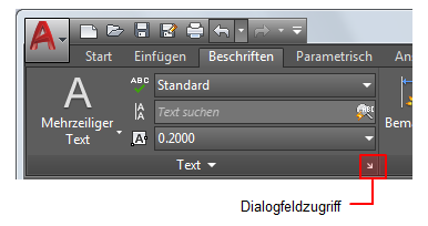 Über einige Multifunktionsleistengruppen kann ein zur betreffenden Gruppe gehöriges Dialogfeld aufgerufen werden. Um das zugehörige Dialogfeld anzuzeigen, klicken Sie in der rechten unteren Ecke der Gruppe auf den Dialogfeldzugriff, der durch ein Pfeilsymbol gekennzeichnet ist .