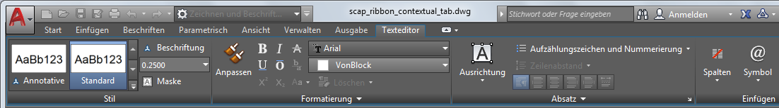 Wenn Sie einen bestimmten Objekttyp auswählen oder bestimmte Befehle ausführen, wird eine kontextabhängige Registerkarte in der Multifunktionsleiste anstelle eines Werkzeugkastens oder Dialogfelds angezeigt. Die kontextabhängige Registerkarte wird geschlossen, wenn Sie den Befehl beenden.