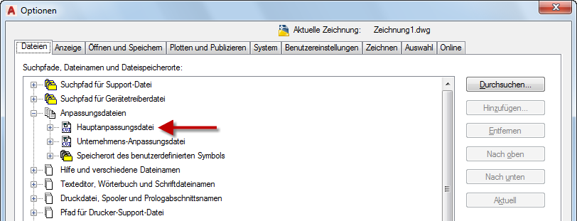 In Anpassungsdateien (CUI/CUIx) werden Benutzeroberflächenelemente definiert, wie z. B. der Schnellzugriffs-Werkzeugkasten (QAT), Multifunktionsleisten-Gruppen und -Registerkarten, Paletten, "klassische" Werkzeugkästen und Pulldown-Menüs. Auf Grundlage der früheren Version, aus der Sie migrieren, sucht das Dienstprogramm Benutzerdefinierte Einstellungen migrieren nach der in der Einstellung Hauptanpassungsdatei angegebenen CUI- oder CUIx-Datei. Die Hauptanpassungsdatei wird zusätzlich zu den partiellen Anpassungsdateien migriert, die in der Haupt-CUI/CUIx-Datei geladen sind.