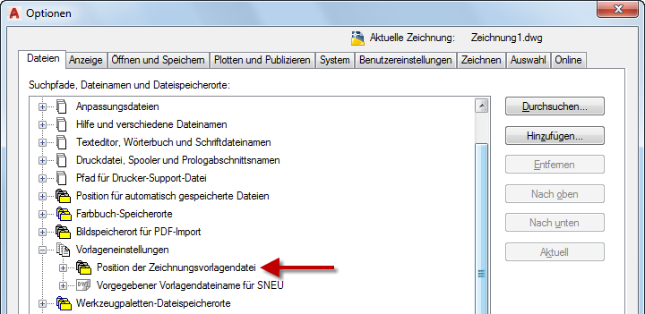 Zeichnungsvorlagendatei (DWT) werden zum Erstellen neuer Zeichnungen verwendet. Die anhand einer DWT-Datei erstellten Zeichnungen enthalten alle Stile und Zeichnungsobjekte, die in der DWT-Datei definiert sind. Die benutzerdefinierten DWT-Dateien aus der früheren Version werden in einen Unterordner mit dem Namen der Zielversion migriert; die Namenskonvention des Unterordners lautet Produktname Templates. Der Unterordner Produktname Templates wird unter dem Ordner erstellt, der in der Einstellung Position der Zeichnungsvorlagendatei definiert ist.