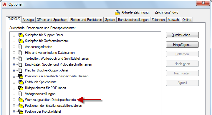 Werkzeugpalettendateien enthalten standardmäßige und benutzerdefinierte Werkzeuge. Die Dateien sind an den Speicherorten abgelegt, die von der Einstellung Werkzeugpaletten-Dateispeicherorte angegeben werden.