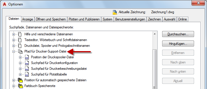 • Plottermodellparameter-Dateien (PMP). Speichern benutzerdefinierte Papierformate und Kalibrierungseinstellungen für ein konfiguriertes Ausgabegerät, das in einer PC3-Datei definiert ist. Die PMP-Dateien aus der früheren Version werden an den Speicherort migriert, der in der Einstellung Suchpfad für Druckerbeschreibungsdatei definiert ist.