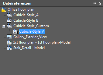 Auf der obersten Ebene der Strukturansicht wird immer die aktuelle Zeichnung angezeigt Referenzierte Dateien erscheinen auf der nächsten Ebene. Referenzierte Dateien, die wiederum eigene verschachtelte Dateireferenzen enthalten, lassen sich öffnen, um weitere Ebenen anzuzeigen. Beim Auswählen von Dateireferenzen in der Strukturansicht kann jeweils nur eine Dateireferenz ausgewählt werden.
