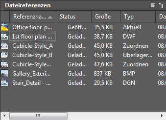 In der Spalte Referenzname wird als erster Eintrag immer die aktuelle Zeichnung angezeigt. Darunter folgen die zusätzlich zugeordneten Dateien, die in der Reihenfolge aufgeführt werden, in der sie zugeordnet wurden.