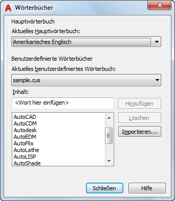 Zeigt den Namen des aktuellen Benutzerwörterbuchs an. Die Erweiterungcus wird für AutoCAD-Benutzerwörterbücher verwendet.