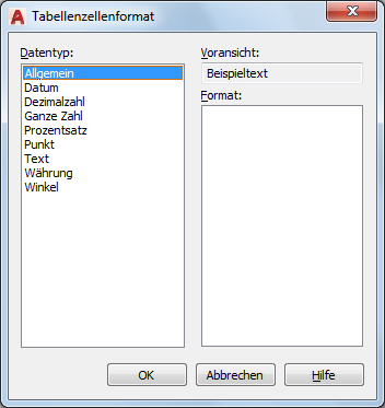 Zeigt eine Liste von Datentypen an (Winkel, Datum, Dezimalzahl usw.), die für Tabellenzeilen formatiert werden können.