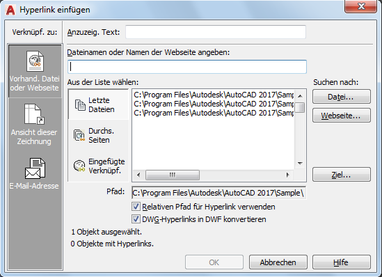 Zeigt den Pfad zur Datei an, die mit dem Hyperlink verknüpft ist. Wenn die Option Relativen Pfad für Hyperlink verwenden aktiviert ist, wird hier lediglich der Dateiname aufgeführt. Wenn die Option Relativen Pfad für Hyperlink verwenden deaktiviert ist, wird der vollständige Pfad und der Dateiname angegeben.