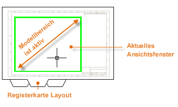 Ein Layout-Ansichtsfenster ist ein Objekt, das im Papierbereich erstellt wird, um eine skalierte Ansicht des Modellbereichs anzuzeigen. Es ist mit einem TV-Monitor vergleichbar, mit dem ein Teil des Modellbereichs überwacht wird. In der Abbildung ist der Modellbereich aktiv und kann vom aktuellen Layout-Ansichtsfenster aus geöffnet werden.