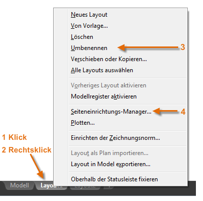 Als Erstes sollten Sie beim Zugriff auf die Registerkarte Layout (1) mit der rechten Maustaste auf die Registerkarte (2) klicken und ihr einen aussagekräftigeren Namen (3) als "Layout 1" geben. Für ein Layout im D-Format bieten sich Arch D oder ANSI D an.