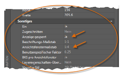 - Wählen Sie in der Palette Eigenschaften in der Dropdown-Liste den Standardmaßstab 1/4" = 1'-0" aus. Damit wird die Ansicht des Modellbereichs genau auf die Zeichnung im D-Format skaliert. Sie ändern auch die Eigenschaft Anzeige gesperrt von Nein in Ja. Dadurch werden versehentliche Anzeigeänderungen an der Ansicht verhindert.
