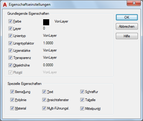 Ändert zusätzlich zu den grundlegenden Objekteigenschaften die Schraffureigenschaften (einschließlich der Beschriftungseigenschaften) des Zielobjekts in die des Quellobjekts. Um den Schraffurursprung abzustimmen, verwenden Sie Eigenschaften anpassen in SCHRAFF oder SCHRAFFEDIT. Nur für Schraffurobjekte.