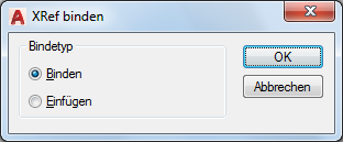 Wenn Sie eine XRef an die aktuelle Zeichnung binden, werden die XRef und alle abhängigen benannten Objekte zu einem Teil der aktuellen Zeichnung. Mit XBINDEN fügen Sie einzelne XRef-abhängige benannte Objekte wie Blöcke, Textstile, Bemaßungsstile, Layer und Linientypen der lokalen Definitionstabelle hinzu. Zum Binden der XRefs an die aktuelle Zeichnung stehen die Methoden Binden und Einfügen zur Verfügung. Mit Binden werden die Definitionstabellennamen der XRef beim Einfügen geändert. Mit der Option Einfügen werden die Definitionstabellennamen der XRef beim Einfügen nicht geändert. Um eine verschachtelte XRef binden zu können, muss auch die übergeordnete XRef ausgewählt werden.