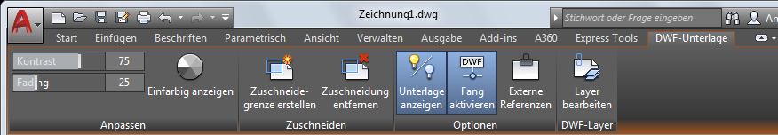 Wenn Sie eine DWF-Unterlage in einer Zeichnung auswählen, wird die Kontextabhängige Registerkarte DWF-Unterlage in der Multifunktionsleiste angezeigt.