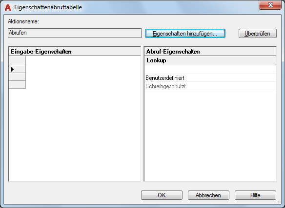 Die Abruftabelle weist der dynamischen Blockreferenz benutzerdefinierte Eigenschaftswerte zu. Wenn Sie den umgekehrten Abruf für eine Abrufeigenschaft wählen, zeigt die Blockreferenz einen Abrufgriff mit einer Liste der Eigenschaften an, welche die Anzeige der dynamischen Blockreferenz ändern.