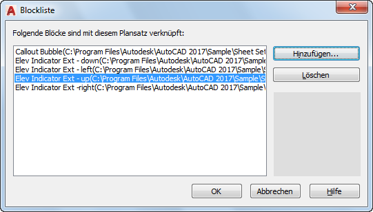 Beschriftungsblöcke, die im aktuellen Plansatz verwendet werden sollen, werden aufgelistet, hinzugefügt oder gelöscht.