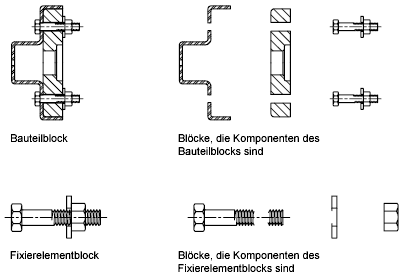 Die Abbildung zeigt eine typische Schrittfolge zum Erstellen einer Blockdefinition in einer Zeichnung.