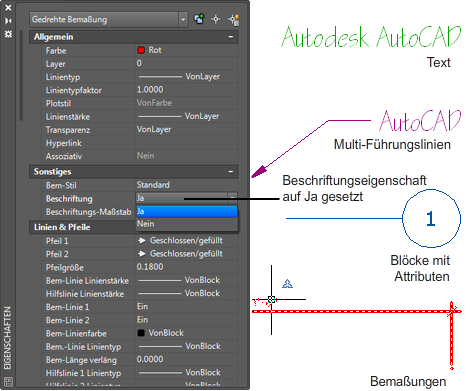 Beschriftungsobjekte umfassen Bemaßungen, Anmerkungen und andere Arten von beschreibenden Symbolen oder Objekten, die häufig dazu dienen, Zeichnungen Informationen hinzuzufügen.