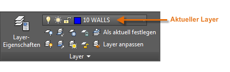 Der Layereigenschaften-Manager nimmt viel Raum ein, und Sie müssen nicht immer Zugriff auf alle Optionen haben. Zum schnellen Zugriff auf die am häufigsten verwendeten Layersteuerelemente verwenden Sie die Steuerelemente in der Multifunktionsleiste. Wenn keine Objekte ausgewählt sind, wird in der Gruppe Layer auf der Registerkarte Start der Name des aktuellen Layers angezeigt, wie hier dargestellt.
