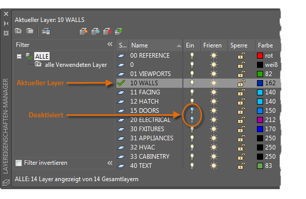 Beachten Sie in der Spalte Ein, dass die Glühlampensymbole für zwei Layer dunkel sind. Diese Layer wurden deaktiviert, um die Türen und Stromleitungen im Grundriss auszublenden.