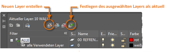 Zum Erstellen eines neuen Layers klicken Sie auf die dargestellte Schaltfläche und geben den Namen des neuen Layers ein. Um einen anderen Layer als aktuellen Layer festzulegen, klicken Sie auf den Layer und anschließend auf die angegebene Schaltfläche.