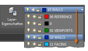 Mit Layern können Sie die Zeichnung strukturieren und vorübergehend die Anzeige von nicht benötigten grafischen Daten unterdrücken. Sie können jedem Layer auch vorgegebene Eigenschaften zuweisen, wie Farbe und Linientyp.