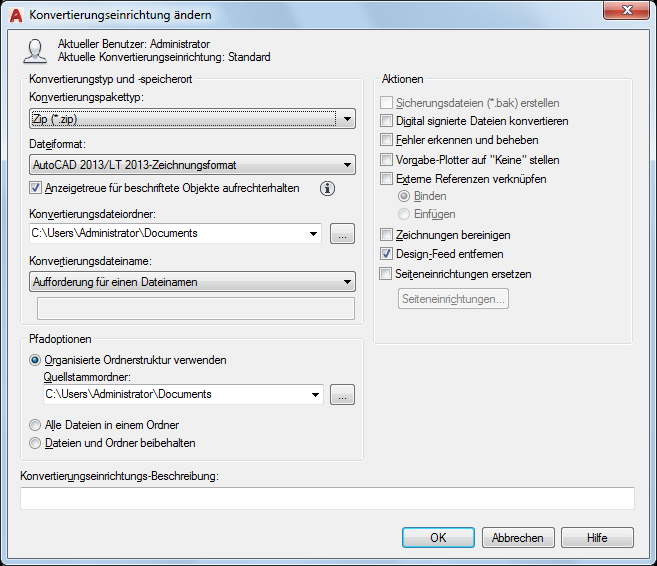 Wenn diese Option aktiviert ist, werden Zeichnungen auf Fehler überprüft. Zeichnungen werden automatisch wiederhergestellt, wenn Fehler gefunden werden. Das Einstellen von Vorgabe-Plottern auf "Keine" ändert die Drucker- /Plottereinstellung im Konvertierungspaket auf Keine. Ihre lokalen Drucker-/Plottereinstellungen sind normalerweise für den Empfänger nicht von Bedeutung.