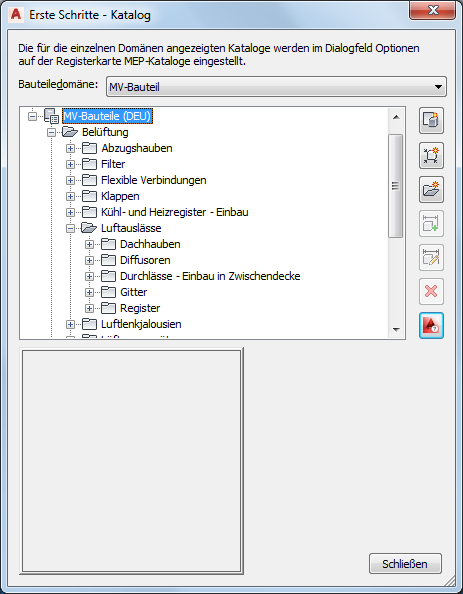 Wenn Sie das Dienstprogramm für die Inhaltsblock-Erstellung starten, wird das Dialogfeld Erste Schritte - Katalog geöffnet. Dieses aufgabenspezifische Dialogfeld funktioniert als Schaltstelle für den schnellen Zugriff auf die verschiedenen Arbeitsumgebungen. Das Dialogfeld Erste Schritte - Katalog enthält einen Bauteilkatalog-Browser und eine Symbolleiste. Sie wählen einen Katalog in der Liste der geladenen Bauteilkataloge aus, die im Dialogfeld Optionen auf der Registerkarte MEP-Kataloge festgelegt wurden. Weitere Informationen über Bauteilkataloge und die Art, wie Bauteile im Katalog gespeichert werden, finden Sie unter "Grundlegendes zu Teilekatalogen".