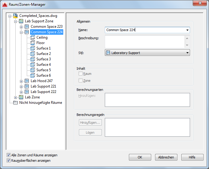 Sie können den Raum/Zonen-Manager verwenden, um die Zonenhierarchie und Rauminformationen wie den Oberflächen- und Öffnungstyp zu überprüfen.