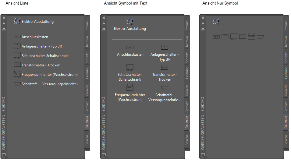 Die gleiche Werkzeugpalette in drei unterschiedlichen Ansichten