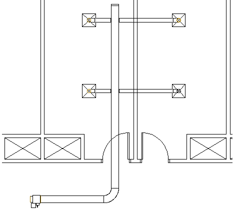 Wenn das Objekt an ein System angeschlossen ist, können Sie angeschlossene Objekte in der aktuellen XY-Ebene ebenfalls verschieben, damit die Verbindungen erhalten bleiben. In den folgenden Abbildungen sehen Sie, wie Sie mithilfe von Positionsgriffen Luftkanal/-rohr-Objekte verschieben können.