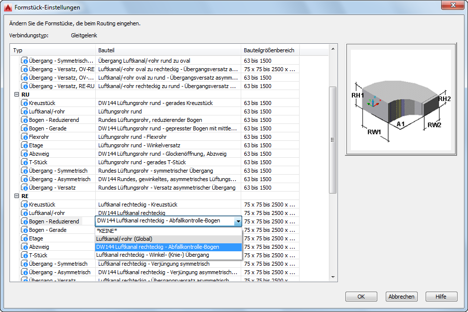 Luftkanal/-rohr - Bauteil-Routing-Voreinstellungen.