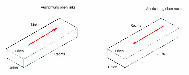 Das folgende Beispiel veranschaulicht den Unterschied zwischen den Ausrichtungen Oben links und Oben rechts bei einem Luftkanal/-rohr-Objekt. Beachten Sie, dass die durch die Pfeile angegebene Zeichnungsrichtung die Darstellung der Ausrichtung in der Zeichnung bestimmt.