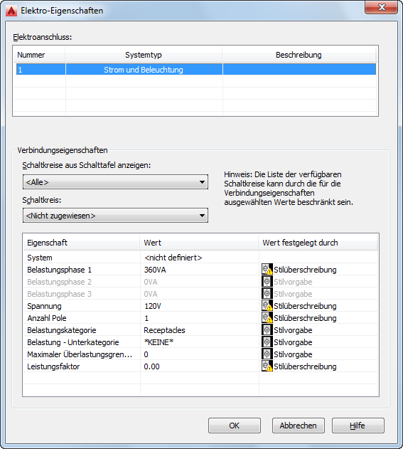 klicken .Das Arbeitsblatt Elektro-Eigenschaften führt die Verbinder am Gerät auf und zeigt für jeden Verbinder den Systemtyp sowie die Beschreibung an. Diese Geräteattribute werden durch den Gerätestil bestimmt. Um ihn zu ändern, ist es erforderlich, die Verbinder im Stil zu ändern.