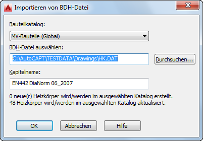 Anhand der ausgewählten Datei wird unter Kapitelname der Herstellername angezeigt. Darunter wird die geplante Anzahl erstellter oder aktualisierter Bauteile angegeben.