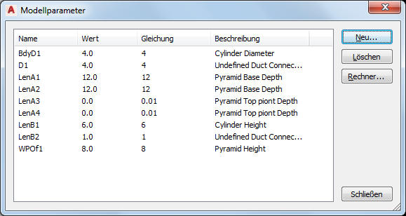 In den Modellparametern Ihres Bauteils enthalten die Beschreibungen der Parameter, die von einem Grundkörper stammen, den Namen des Grundkörpers. Dies vereinfacht es, die Parameter zu unterscheiden, wenn Sie dem Bauteil mehrere Grundkörper hinzugefügt haben oder im Bauteil eine Mischung von Grundkörpern und manuell hinzugefügten Merkmalen vorhanden sind.