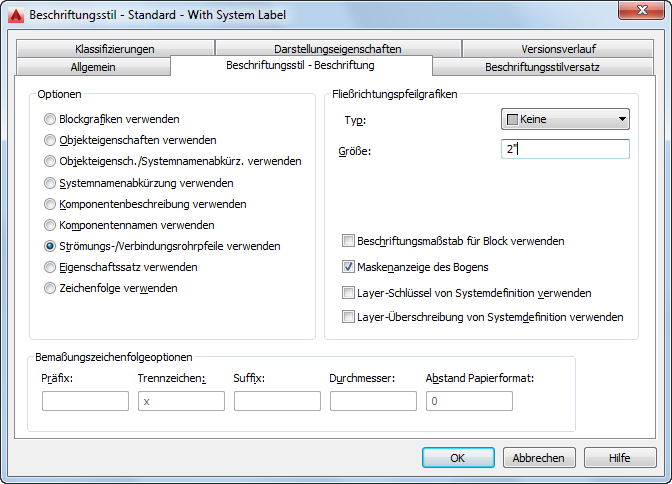 Wenn ein Beschriftungsbogen-Stil Blockgrafiken oder Fließrichtungspfeilgrafiken verwendet und unter Stil die Option Beschriftungsmaßstab für Block verwenden ausgewählt ist, dann wird der Stil als Beschriftung betrachtet. Zu einfacheren Bedienung ist diese Option standardmäßig ausgewählt, wenn Sie einen Block auswählen, für dessen Beschriftungseigenschaft die Einstellung Ja festgelegt ist. Sie können die Option jedoch deaktivieren.