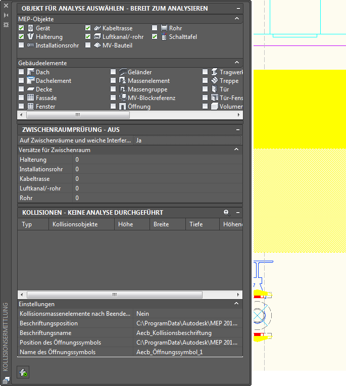 Anmerkung: Der Kollisionsanalysemodus wird pro Zeichnung jeweils durchgeführt. Wenn Sie zu einer anderen Zeichnung wechseln, wird die Palette für Kollisionsermittlung basierend auf der derzeit aktiven Zeichnung aktualisiert.