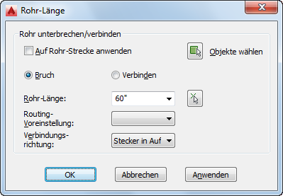 | Unterbrechen eines Segments | Aktivieren Sie Unterbrechen, und geben Sie einen Wert für Rohrlänge ein. Sie können auch auf |