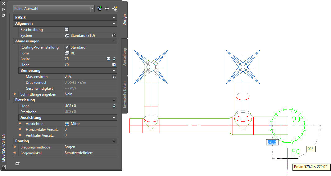 Wenn Sie der Auslassausstattung Volumenstromwerte zugewiesen haben, können Sie mit dem Sofortberechnungswerkzeug beim Zeichnen von Luftkanal/-rohr-Strecken die Größen des Luftkanal/-rohr-Systems berechnen. Das Sofortberechnungswerkzeug kann auch zum Ändern von vorhandenen Luftkanal/-rohr-Strecken verwendet werden.