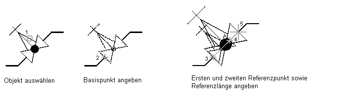 Sie können die Größe eines Schemasymbols mithilfe einer Referenz ändern. Wenn Sie die Größe mithilfe einer Referenz ändern, geben Sie die aktuelle Länge eines Symbols als Referenz für die neue Länge an. Wenn beispielsweise eine Seite eines Schemasymbols 2.5 Einheiten lang ist und Sie es auf 3.5 Einheiten vergrößern möchten, benutzen Sie 2.5 als Referenzlänge und 3.5 als die neue Länge. Sie können auch skalieren, indem Sie einen Basispunkt und zwei Referenzpunkte angeben und das Symbol ziehen.