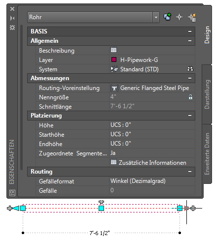 Die Länge eines Rohrsegments wird durch separate Verbindungen genau dargestellt. Die Schnittlänge auf der Eigenschaftenpalette ist die tatsächliche Länge des Rohrs und enthält Tiefen zum Einrasten der Flansche.
