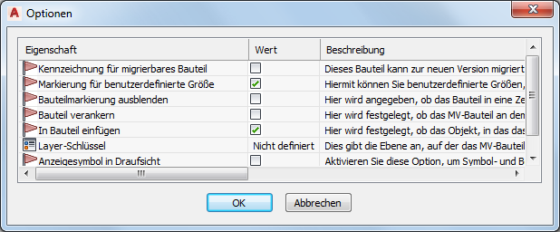 Dialogfeld Optionen eines parametrischen MV-Bauteils