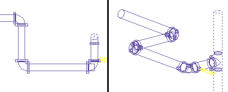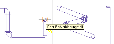 Nehmen Sie als Beispiel ein Szenario, in dem Sie in der Draufsicht arbeiten. Sie möchten eine horizontale Strecke mit einer Steigleitung verbinden. Im Zeichnungsfenster sind zwei Ansichtsfenster konfiguriert. Im linken Bereich ist eine Ansicht von oben zu sehen. Der rechte Bereich wird für eine isometrische Ansicht zur Vorschau der Routing-Lösungen verwendet. In der Ansicht von oben ist nur der Rohr-Endverbinder der Steigleitung verfügbar.