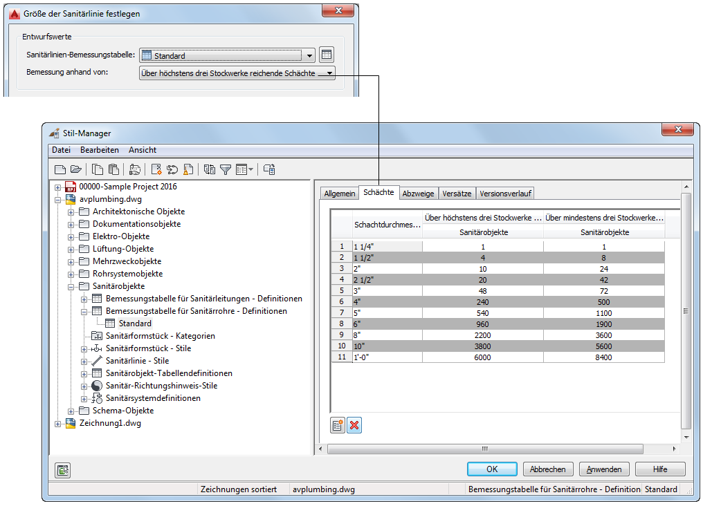 Wenn Sie die Sanitärstrecke als Stapel für höchstens drei Stockwerke definieren, führt das Sanitärmodul die Größenberechnungen anhand der Daten auf der Registerkarte Stapel der Sanitärlinien-Bemessungstabelle (Rohrbemessungstabelle) aus, deren Definitionen im Stil-Manager zu finden sind.