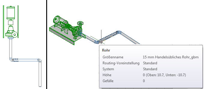 Im folgenden Beispiel werden Rohrsysteme mit Gefälle in der Draufsicht und SW-Isometrieansicht gezeigt.