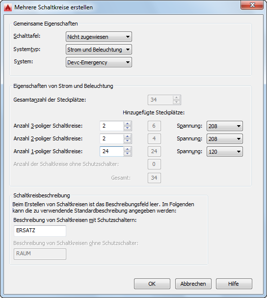 - Geben Sie im Dialogfeld Mehrere Schaltkreise erstellen unter Gemeinsame Eigenschaften Folgendes an: